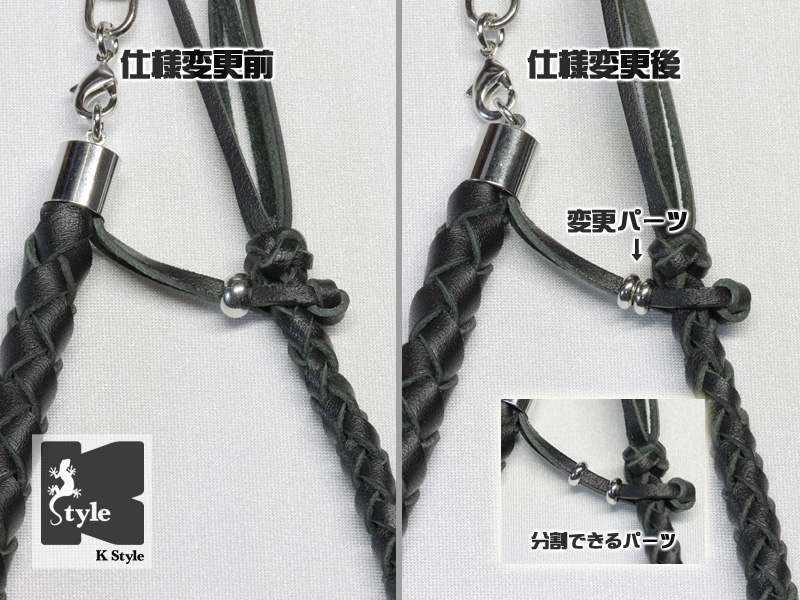 先端部を止める金属パーツ(銀色)を2つに分割できる金属パーツに変更)しました。