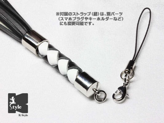 オプションで、ストラップ(紐)をキーホルダーに変更する事でバッグなどに取り付ける事も可能です→
