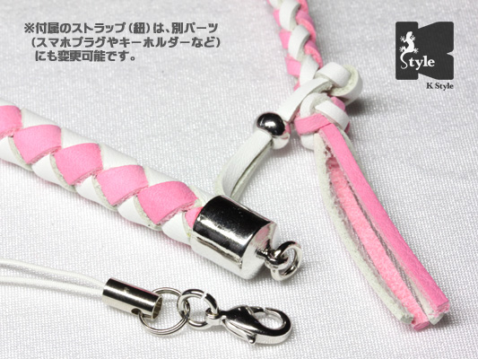 オプションで、ストラップ(紐)をキーホルダーに変更する事でバッグなどに取り付ける事も可能です→