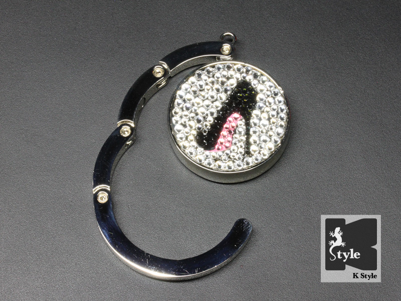 クリスタル、ローズピンク、黒3色のスワロフスキーを使用し、ルブタン風のピンヒールをデコレーションしたバッグハンガー(丸型)です。